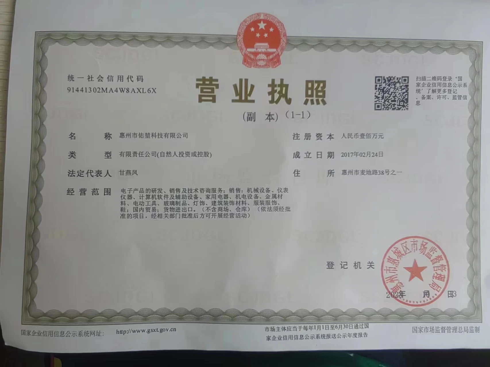 Registered address : One Of 38 Wheat Field Road Huizhou Guangdong China
